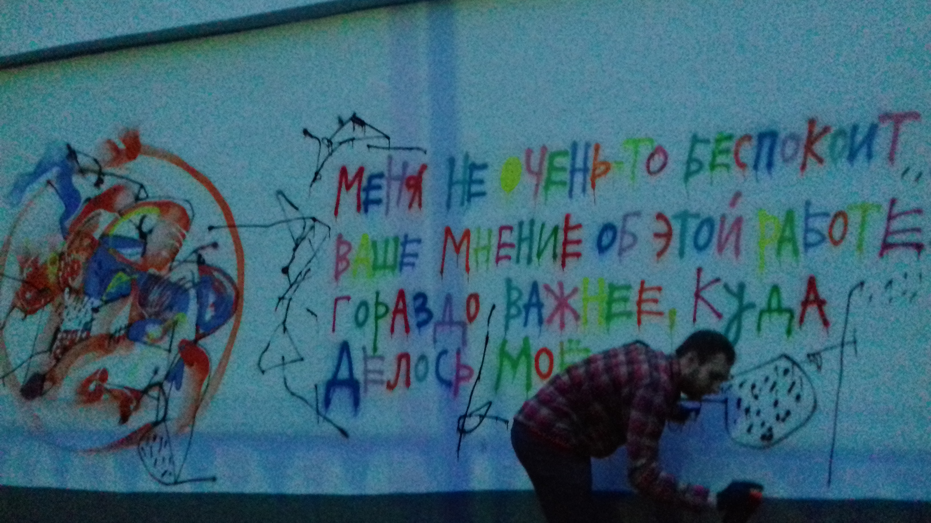 В 15м году я опять возвращаюсь к надписям. Но уже, конечно, не таким откровенным. И дидактизма уже прежнего нет и сомнения свои я удерживаюсь и все скопом не вываливаю. Почему-то почти нет совсем фотографий из 2016 года. Я действительно так мало работал или просто не фиксировал/не сохранилось? Уже сам не помню и не понимаю. В 17м году послания опять стали регулярными. Но чаще не про переживаемое внутри что-то личное, а отвлеченные, рекурсивные, про свойства самих работ. В 2018 году мне опять не до писаний. Всё время я провожу в непрерывном фланировании и коммуникации с «Маленькими Людьми» ( Иван Симонов, частый соавтор 2017 года научил меня этому термину и усилил существовавшую и прежде тягу ко всяким маргиналиям).