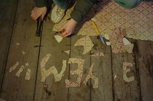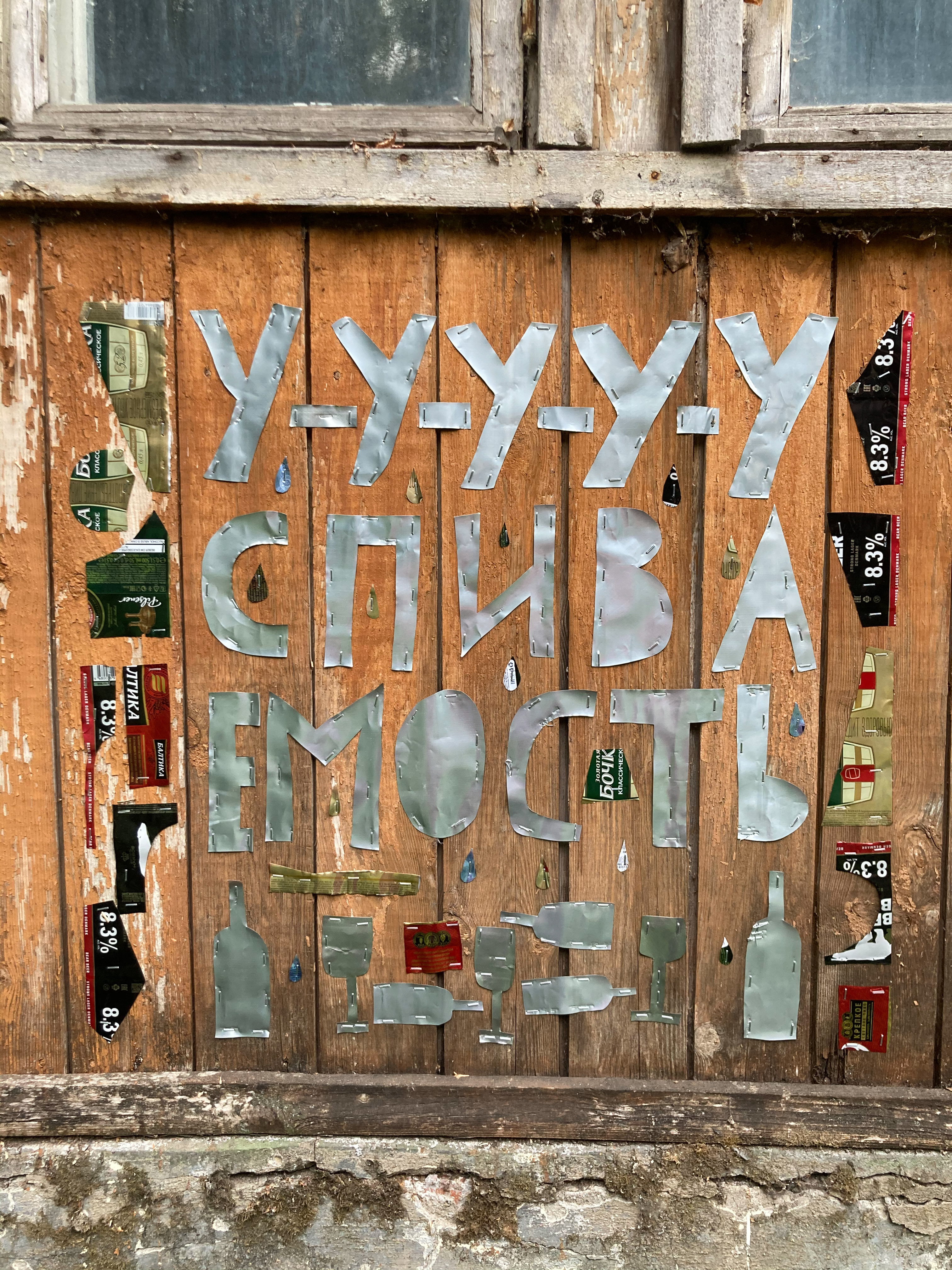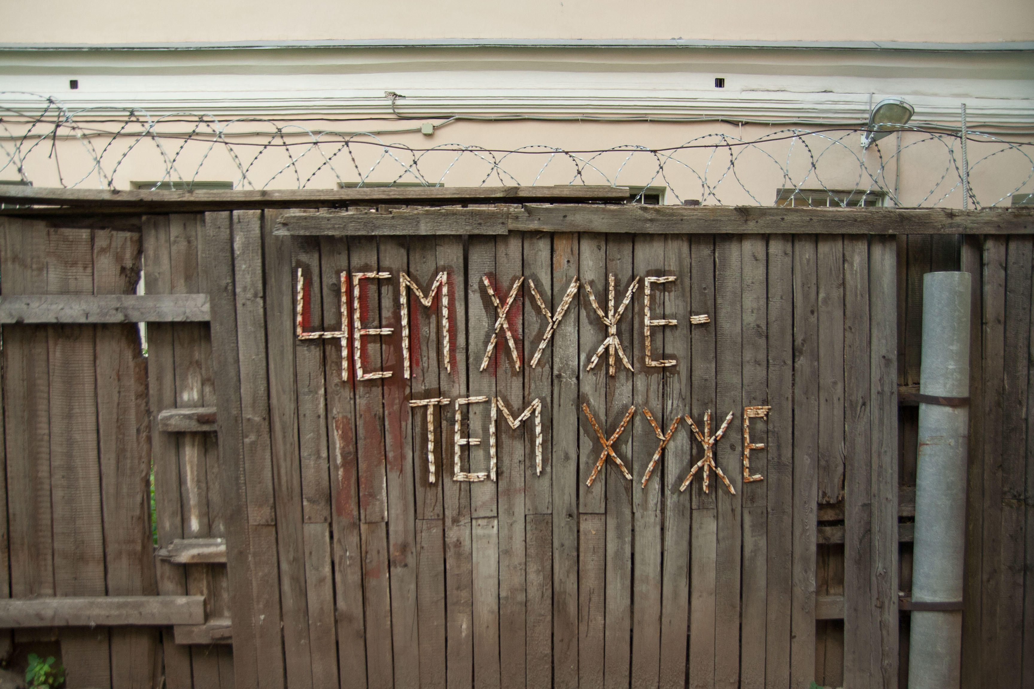 2003 и 2004 год мне пришлось провести на Украине, в городе Кривой Рог, куда я был отправлен ухаживать за тяжело больной бабушкой. Надо понимать, что это был за город. Жесткий, промышленный, грязный, с экологией полный швах. Никакой особой культурной жизни там тоже не замечалось. По крайней мере, по части искусства. Никаких галерей и один чахлый музейчик с нафталиновыми работами художников-пенсионеров. Граффити не было. Вообще. Даже краски не было. Ее приходилось заказывать из соседнего Днепропетровска (теперь Днепра). Хотя Кривой Рог — город немаленький, 800 000 жителей всё-таки. И что мне оставалось делать, как не то же самое, что и в Москве? Сперва так и было — добыв некоторое количество краски, я создал несколько работ. Их моментально заметили. Но все равно с таким привычным медиумом было сложно. Я стал искать что-то новое, что-то, что будет более органично вписано в контекст. Как и у многих, мой уже умерший дед и больная бабушка накопили за жизнь кучу барахла. Советское скопидомство. В гардеробе у деда, например, я нашел больше сотни рубашек. Но важнее и интереснее были материалы, бросовые, но почему-то, зачем-то нужные моим предкам и накопленные ими. Крышечки из фольги от кефира, засвеченные фотопленки, спичечные коробки, обложки от толстых тетрадей, клеенки, отрезы тканей, лоскуты, обрезки линолеума, трубочки от капельниц (ну, это понятно для чего — из них мой дед плел своих фирменных рыбок для брелоков). Выкинуть жалко, надо как-то использовать, раз уж дед с бабушкой столько лет это собирали. Такая отсылка к эпохе тотального дефицита.
