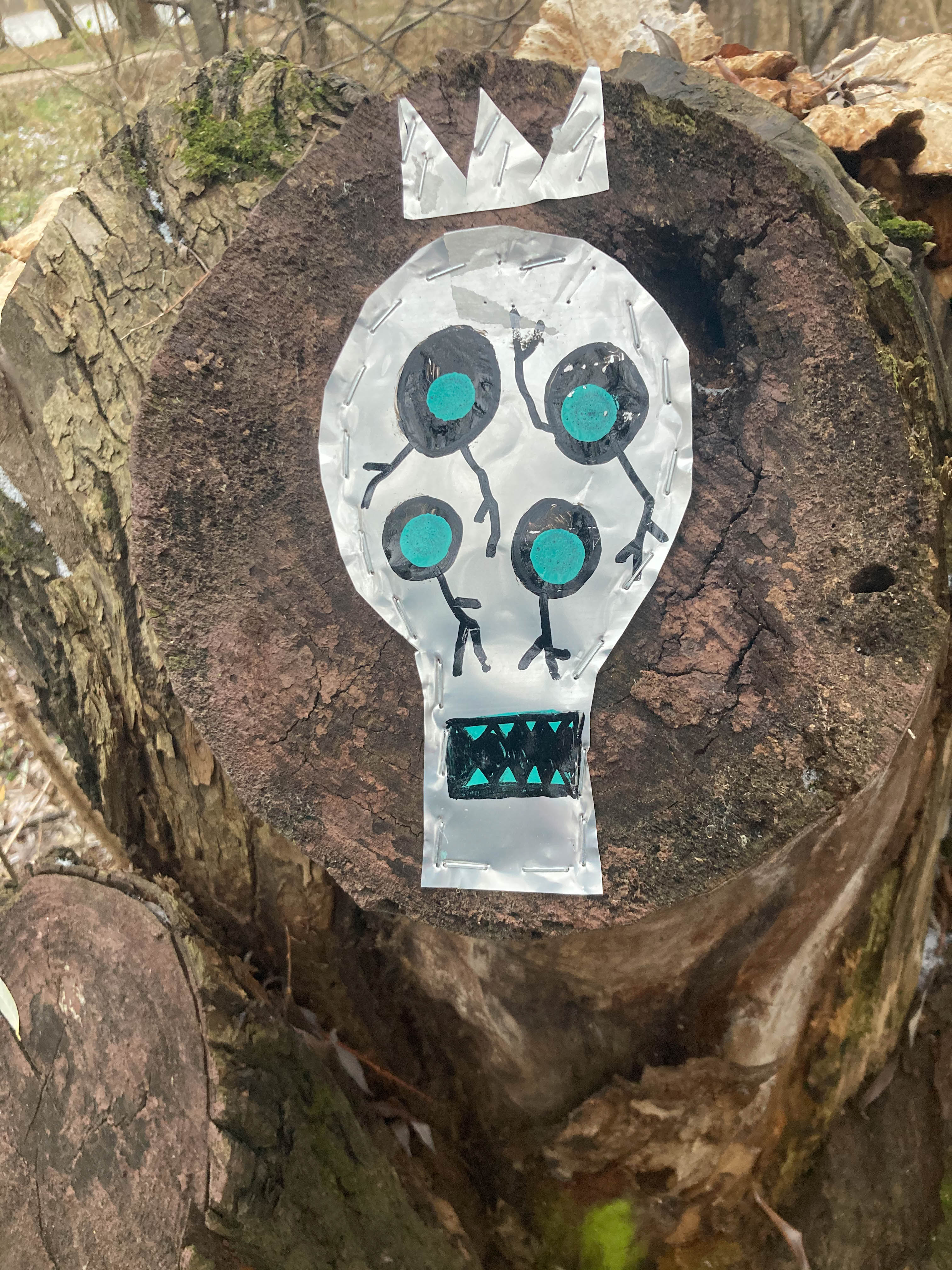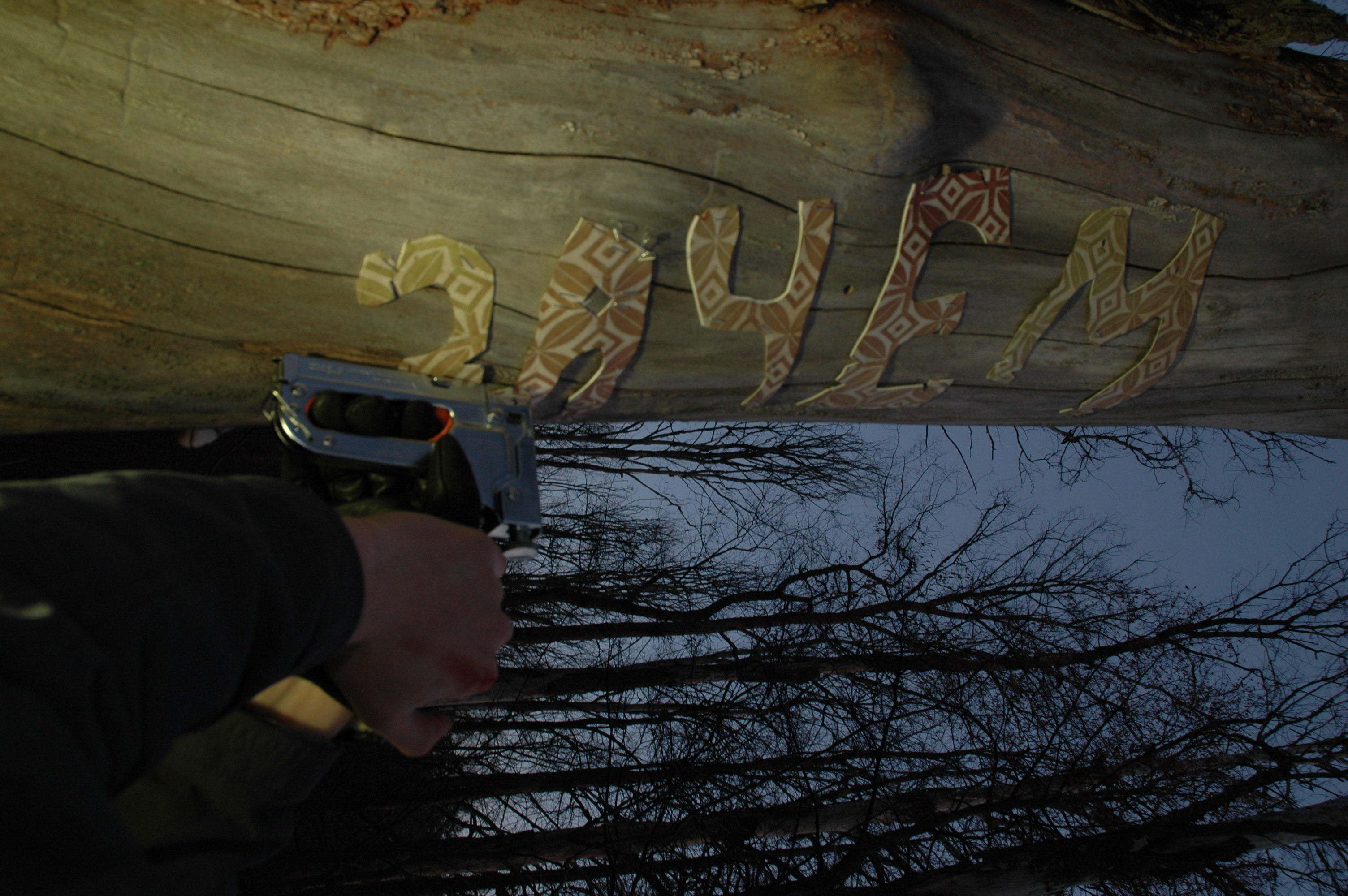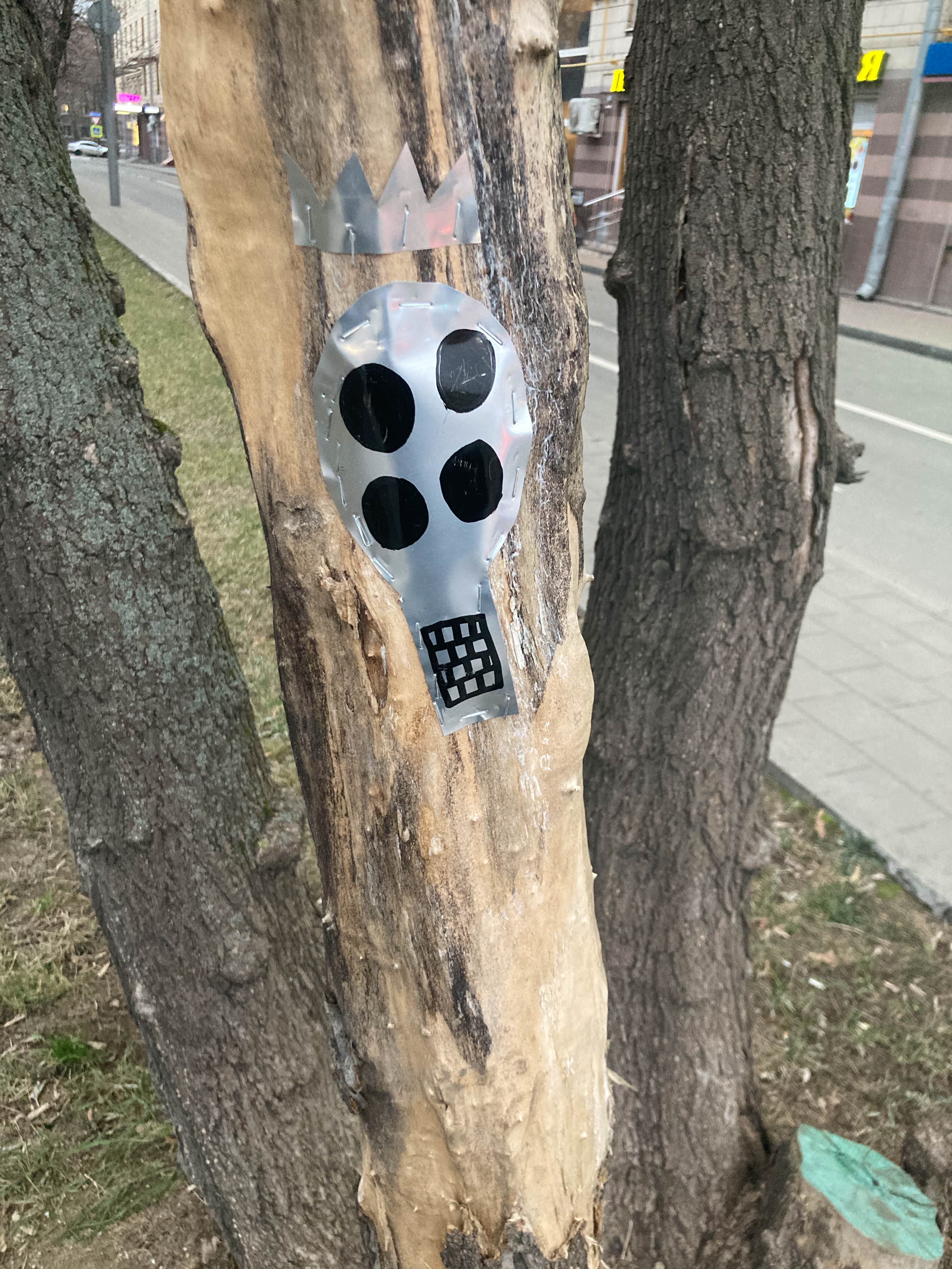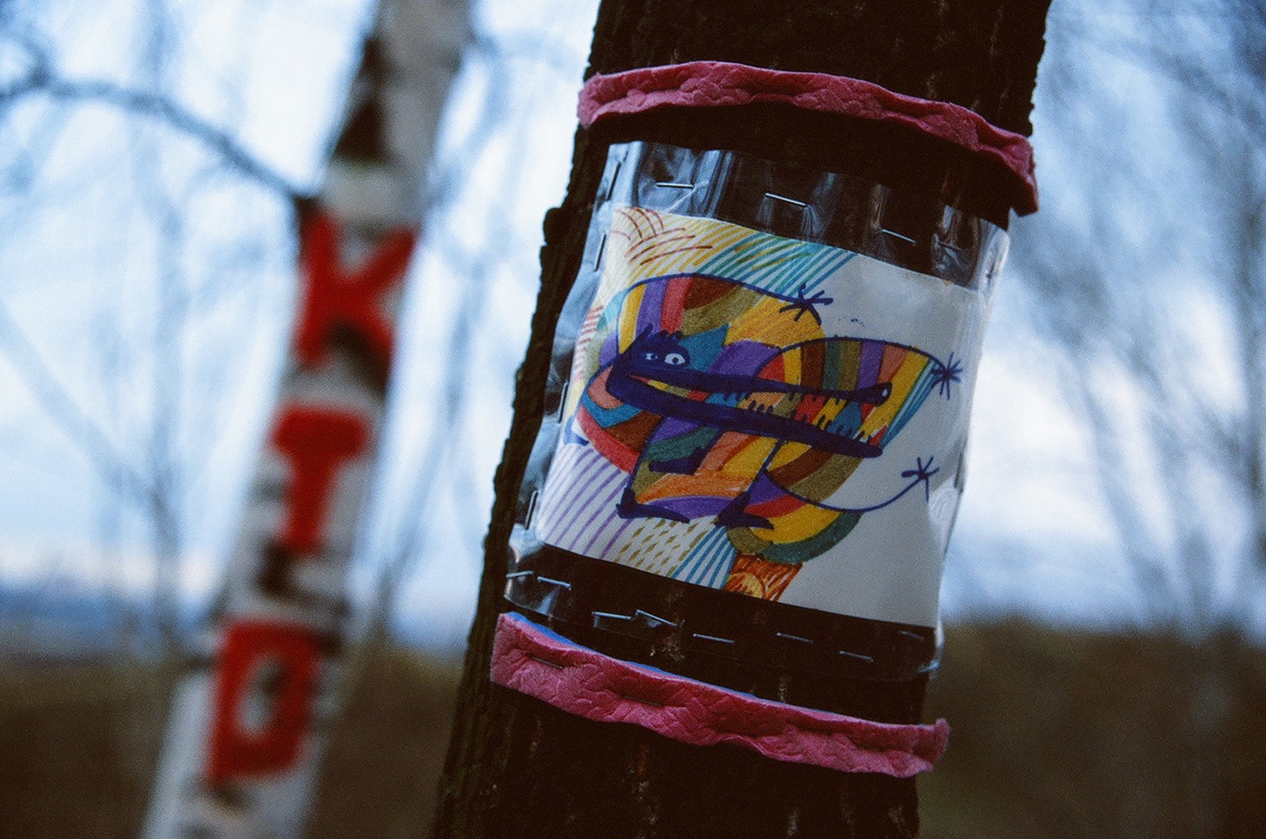 Каким-то образом я познакомился со степлером. Не канцелярским — строительным. Стал делать ассамбляжи. На деревьях, в лесах. По факту, правда, это были не леса, а посадки в зонах обрушения (Кривой Рог испещрен шахтами чуть ли не по всей территории, там добывают железную руду) и небольшие заросли на отвалах (искусственные холмы, созданные из пустой породы). Это был разворот на 180 градусов. Если граффити и стрит-арт стараются располагаться в максимально заметных местах, то мои работы из дедушкиного / бабушкиного хлама и моих окурков (их тоже решено было пустить в дело) мог вообще никто никогда не встретить. Ну, случайный путник, шатающийся по отвалам, мало кто. Таких предполагаемых зрителей я называл «Случайно избранные». С фотофиксацией было сложно, многие работы я делал только ради процесса, медитативной, монотонной практики, некоторые удалось заснять, но на чужой, соседский фотоаппарат с низким разрешением. Вернувшись в Москву, я продолжил серию уже в местных лесах, поняв, что хлам — он и есть хлам, и необязательно ему быть собранным твоими предками и согретым теплом их рук. Не так уж все это сакрально. Можно использовать свой. В дело шло все — те же обрезки ткани, кожзаменителя и линолеума, жесть от пивных банок, обрезки ковролина и пенок для йоги. Уход в леса. Та же идея — не стремиться навязать всякому прохожему свое творчество в сутолоке города, где ему часто суждено потеряться в визуальном мусоре, конкурируя с другими шумами, а внезапно ошарашить какого-нибудь лесника или грибника странной работой в месте, где он точно не ожидал что-то подобное встретить.