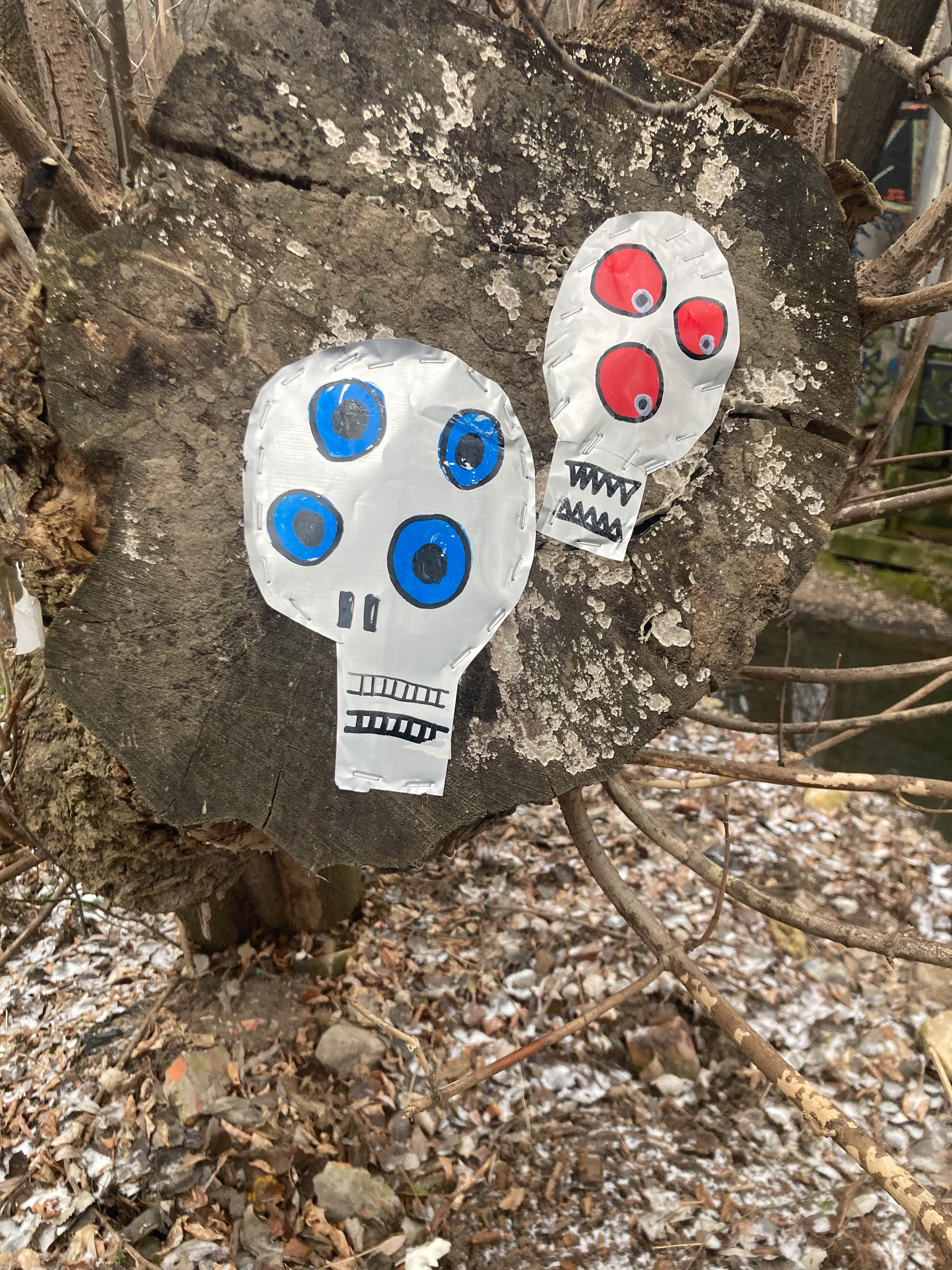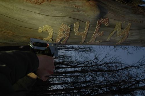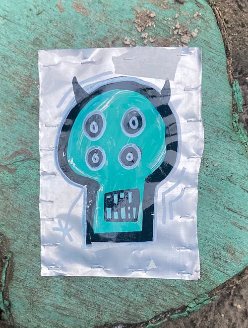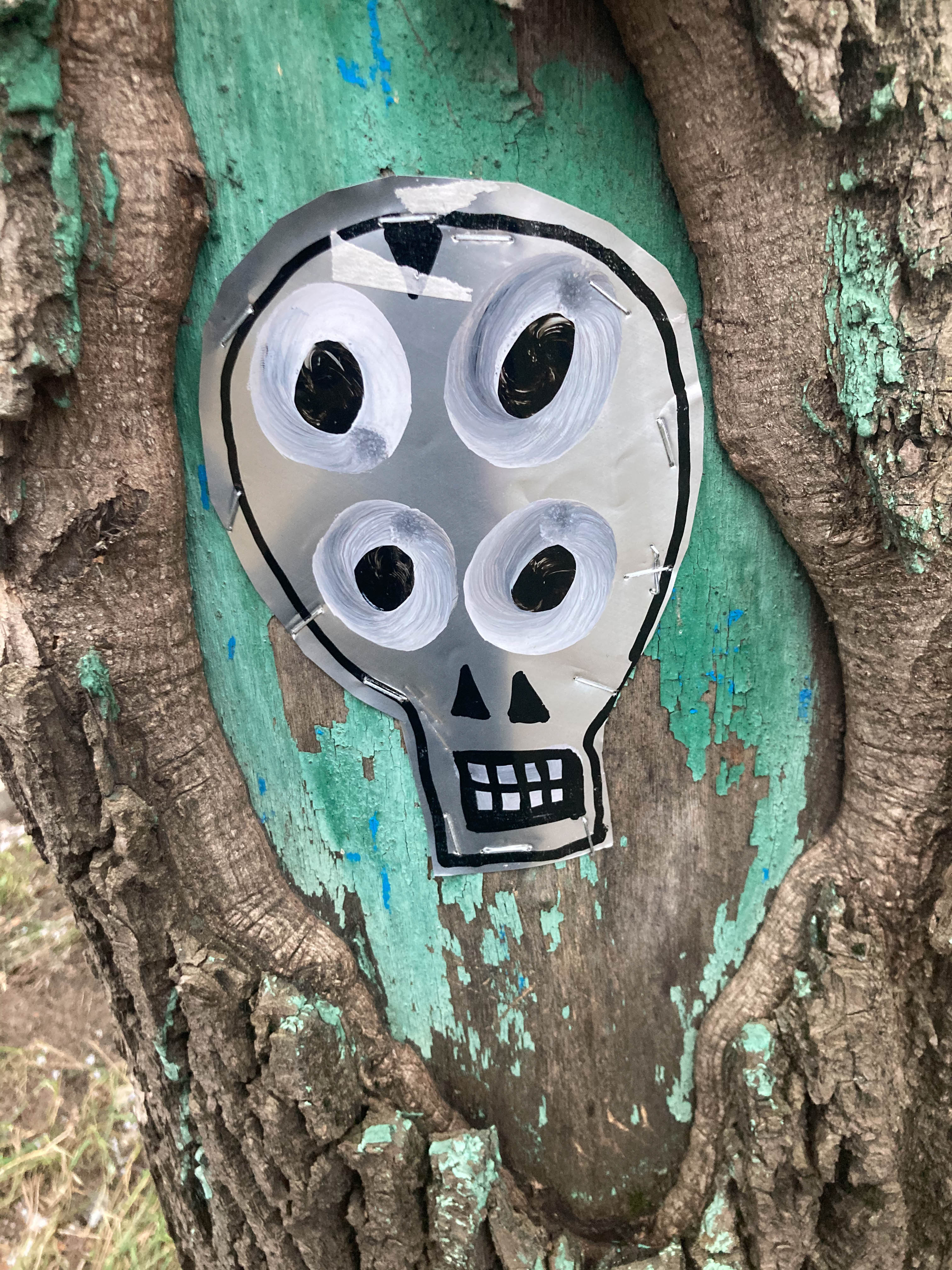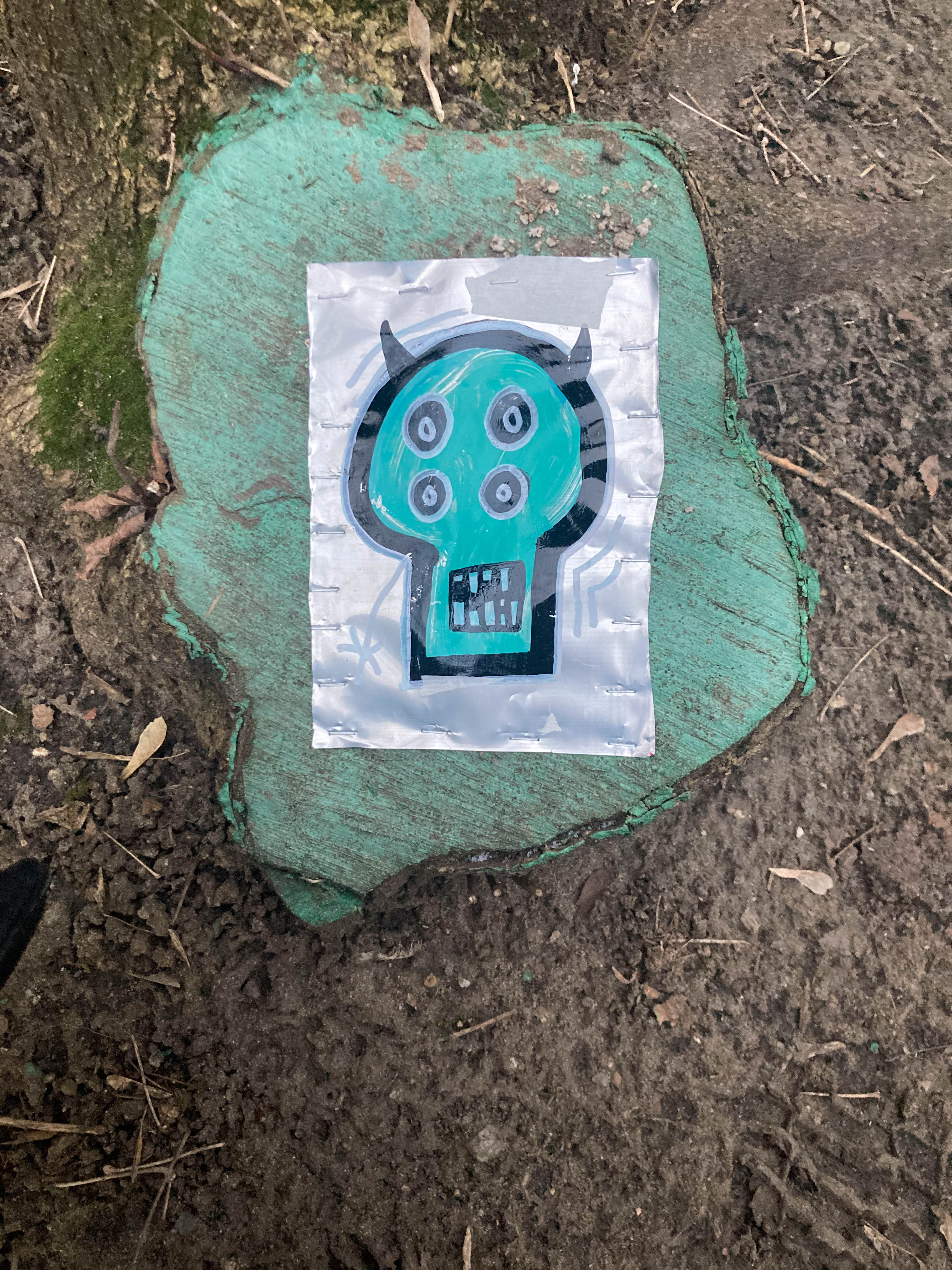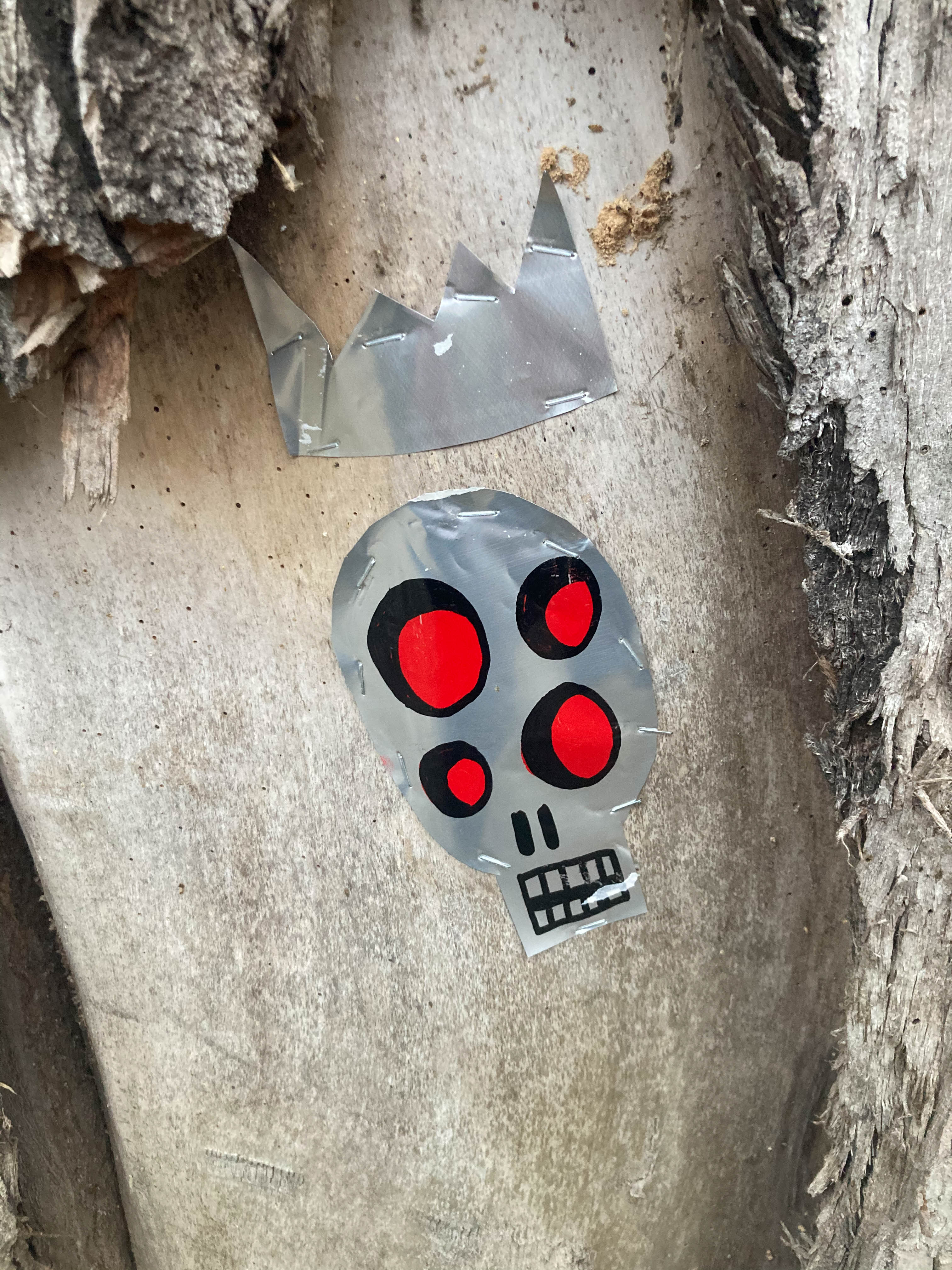 Каким-то образом я познакомился со степлером. Не канцелярским — строительным. Стал делать ассамбляжи. На деревьях, в лесах. По факту, правда, это были не леса, а посадки в зонах обрушения (Кривой Рог испещрен шахтами чуть ли не по всей территории, там добывают железную руду) и небольшие заросли на отвалах (искусственные холмы, созданные из пустой породы). Это был разворот на 180 градусов. Если граффити и стрит-арт стараются располагаться в максимально заметных местах, то мои работы из дедушкиного / бабушкиного хлама и моих окурков (их тоже решено было пустить в дело) мог вообще никто никогда не встретить. Ну, случайный путник, шатающийся по отвалам, мало кто. Таких предполагаемых зрителей я называл «Случайно избранные». С фотофиксацией было сложно, многие работы я делал только ради процесса, медитативной, монотонной практики, некоторые удалось заснять, но на чужой, соседский фотоаппарат с низким разрешением. Вернувшись в Москву, я продолжил серию уже в местных лесах, поняв, что хлам — он и есть хлам, и необязательно ему быть собранным твоими предками и согретым теплом их рук. Не так уж все это сакрально. Можно использовать свой. В дело шло все — те же обрезки ткани, кожзаменителя и линолеума, жесть от пивных банок, обрезки ковролина и пенок для йоги. Уход в леса. Та же идея — не стремиться навязать всякому прохожему свое творчество в сутолоке города, где ему часто суждено потеряться в визуальном мусоре, конкурируя с другими шумами, а внезапно ошарашить какого-нибудь лесника или грибника странной работой в месте, где он точно не ожидал что-то подобное встретить.