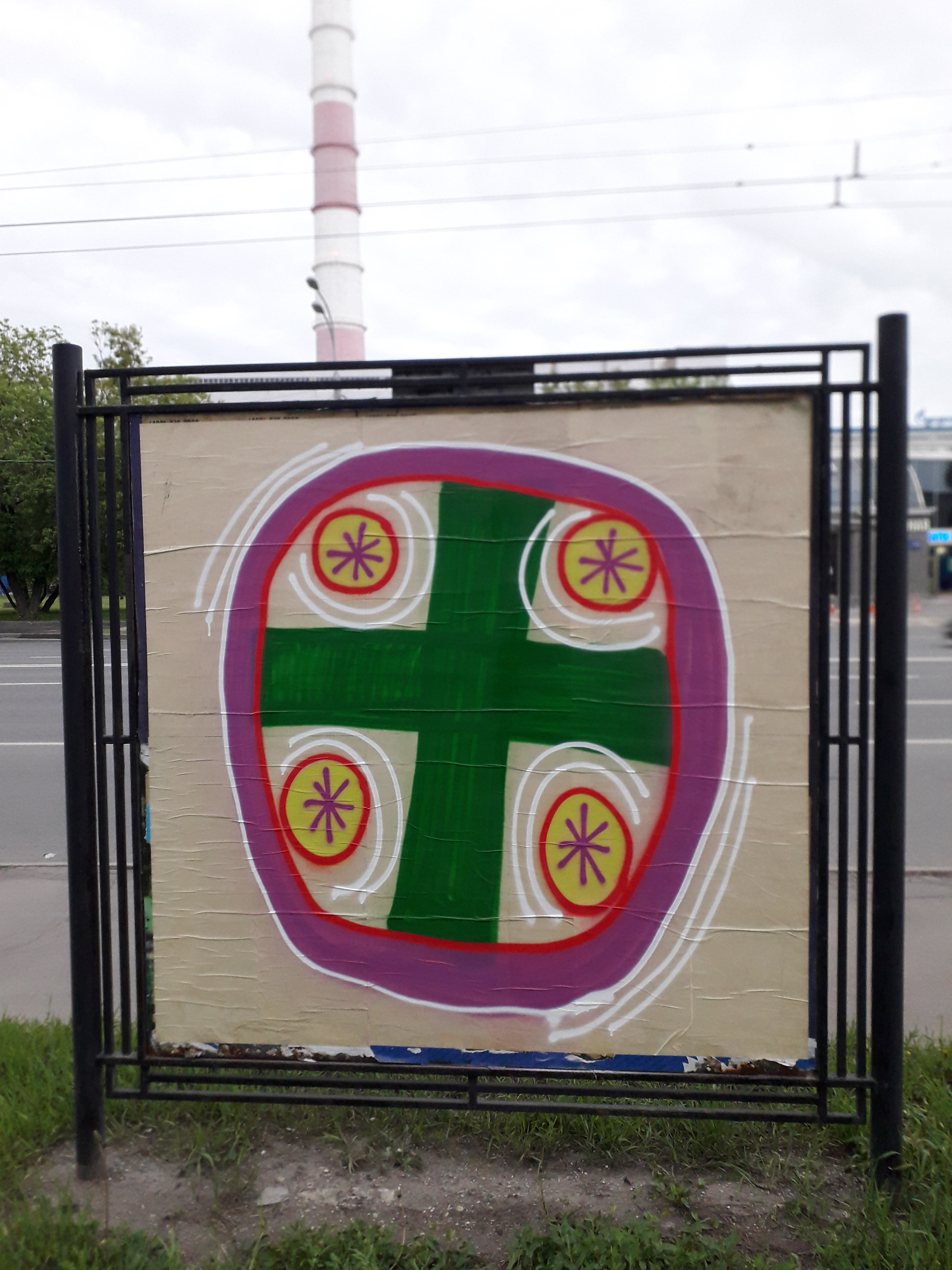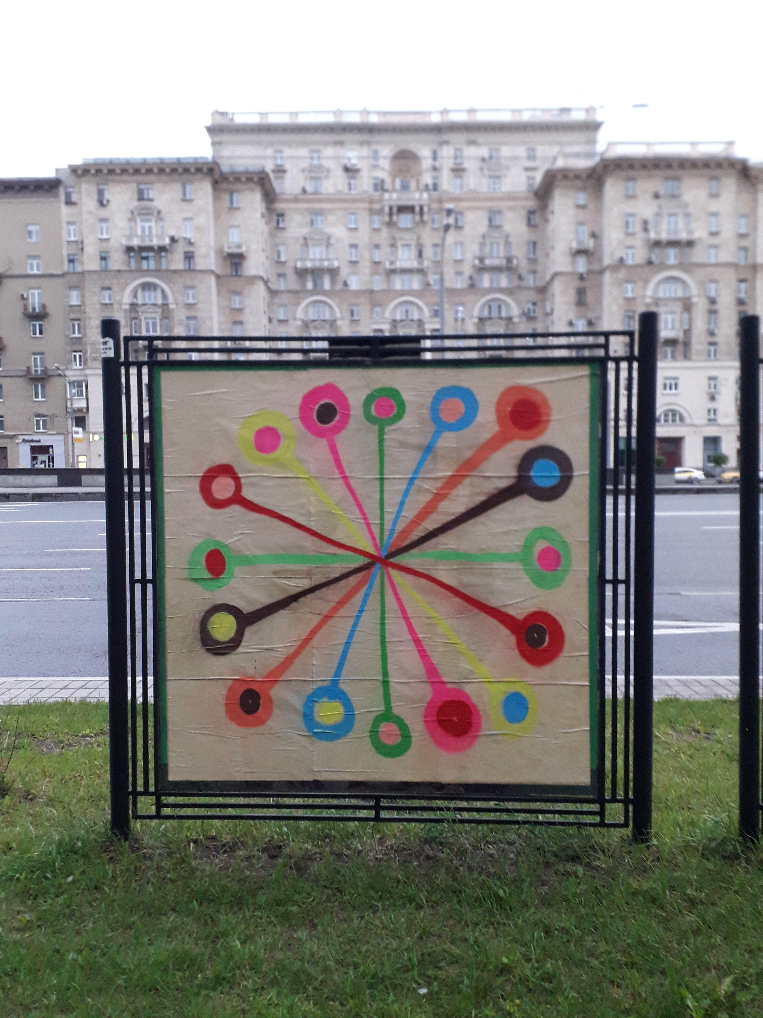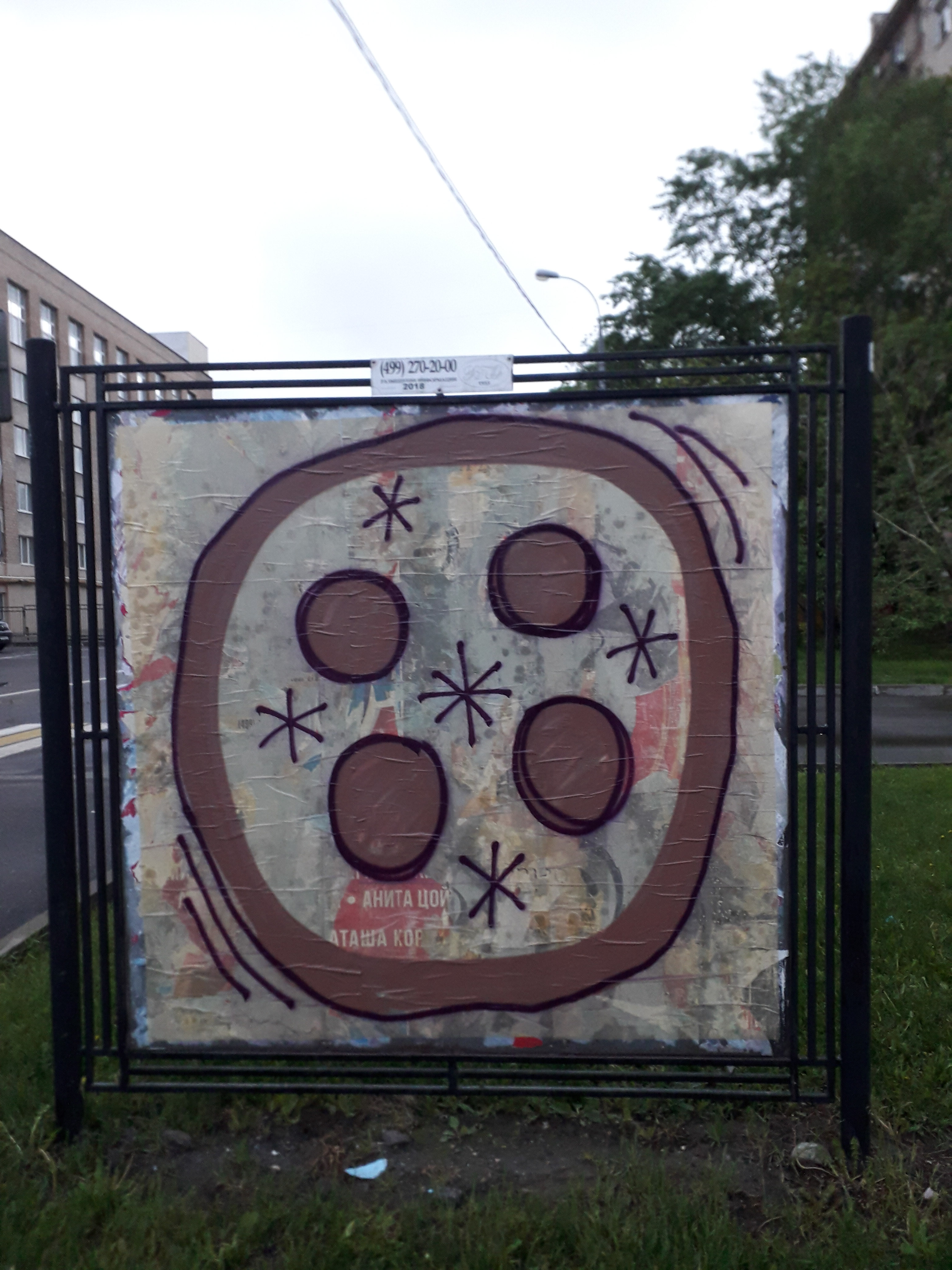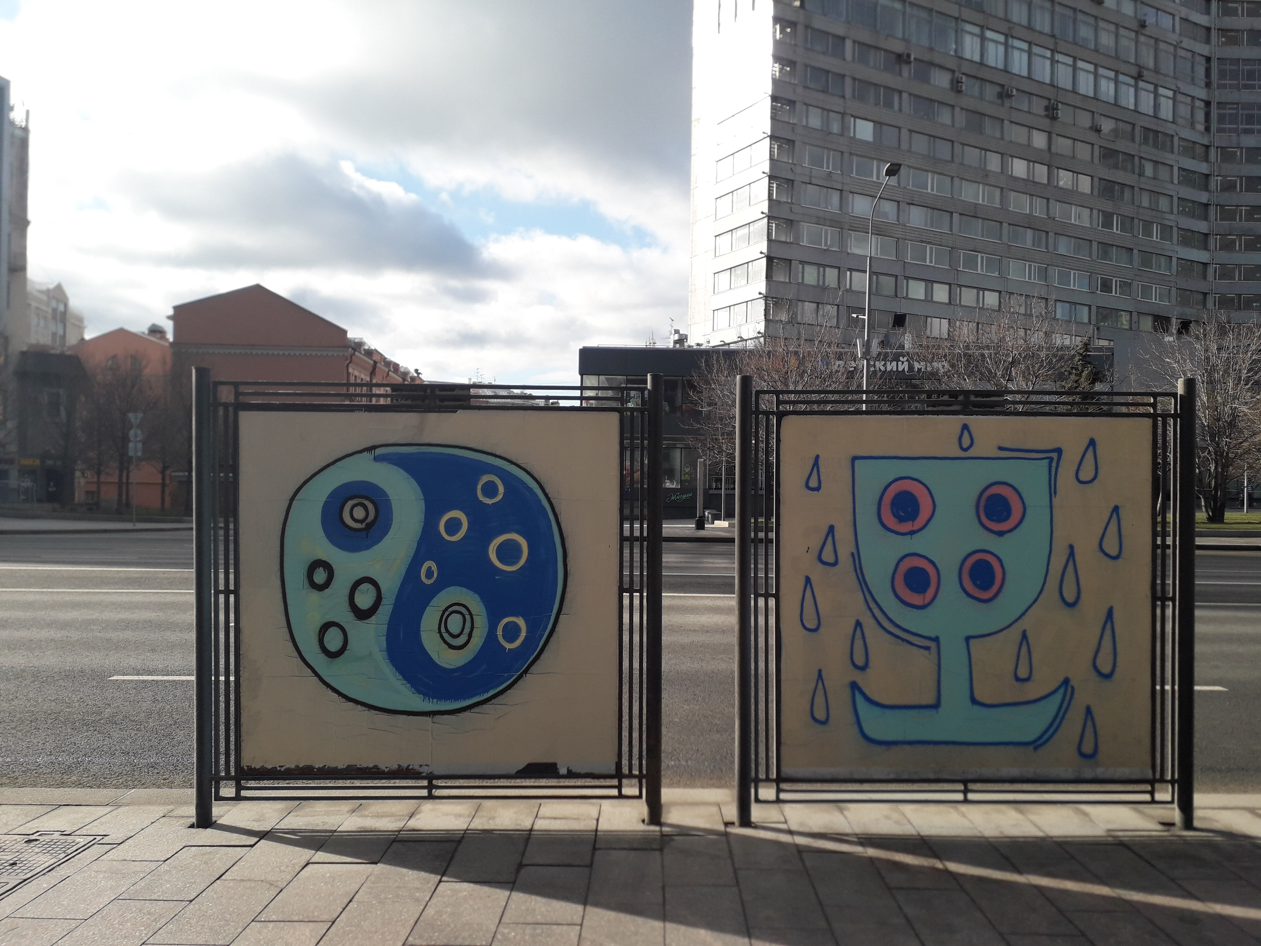 Наиболее часто используемый Кириллом Кто символ – это рыбка (или ракета). По своему формообразованию и природе она ближе всего к тегу, поэтому автор использует ее для маркировки городского пространства. Ракета (или рыбка) стремительно летит вдоль водосточных труб, выныривает из пространства улицы, сплошь забитого тегами граффити-райтеров, устремляется ввысь.